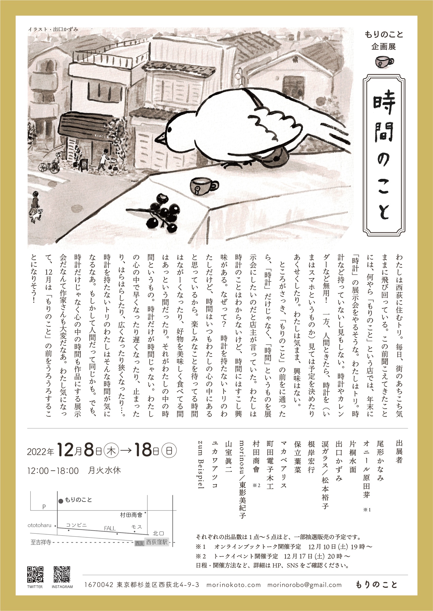 2022.12/ 8 ~ 18 12:00-18:00 会期中月火水休み出展者尾形かなみオニール原田芽片桐水面Zum Beispiel 出口かずみ涙ガラス/松本裕子根岸宏行保立葉菜マカベアリス町田電子木工村田商會morinosu/東影美紀子山室眞二ユカワアツコ もりのこと 東京都杉並区西荻北4-9-3 お近くにお越しの際はぜひお立ち寄りください。